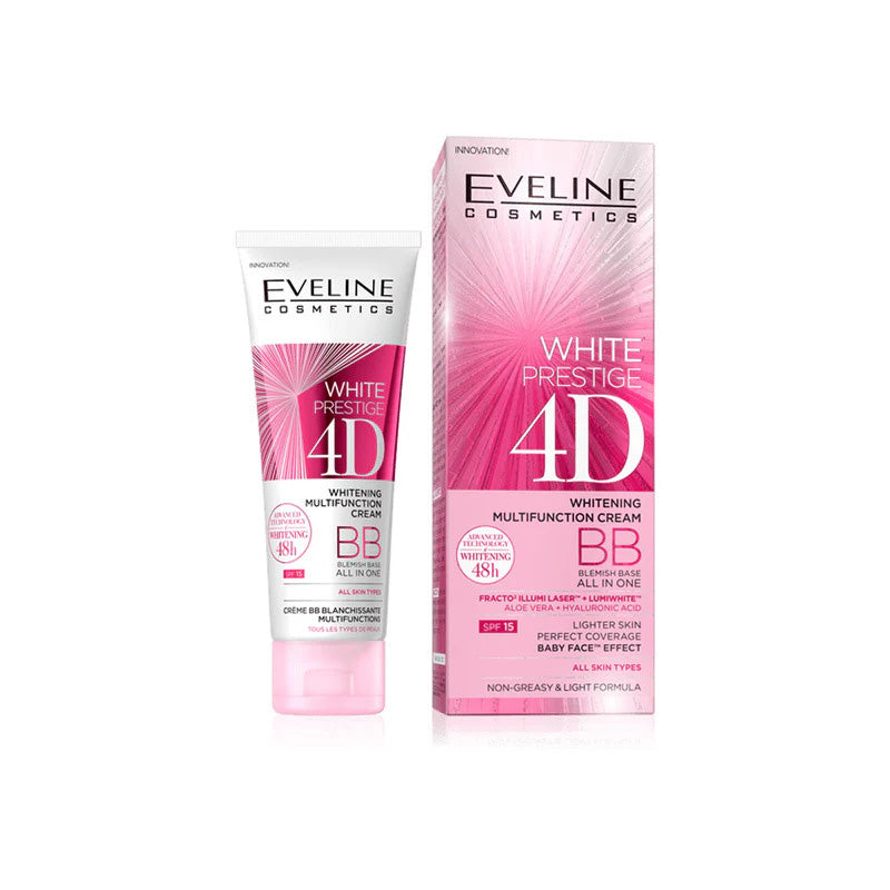 Eveline White Prestige 4D BB Cream 50 ml is a multi-functional beauty balm that provides light coverage while brightening and evening out skin tone. Enriched with a 4D whitening complex, it helps reduce dark spots and promote a radiant complexion. This BB cream also hydrates, protects with SPF, and smooths the skin, offering a flawless, natural finish. Ideal for daily use to achieve a luminous, even skin tone with a subtle glow