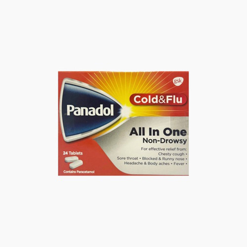 | Panadol Cold & Flu All in one tablet provide relives from cold & flu symptoms including chesty cough. |